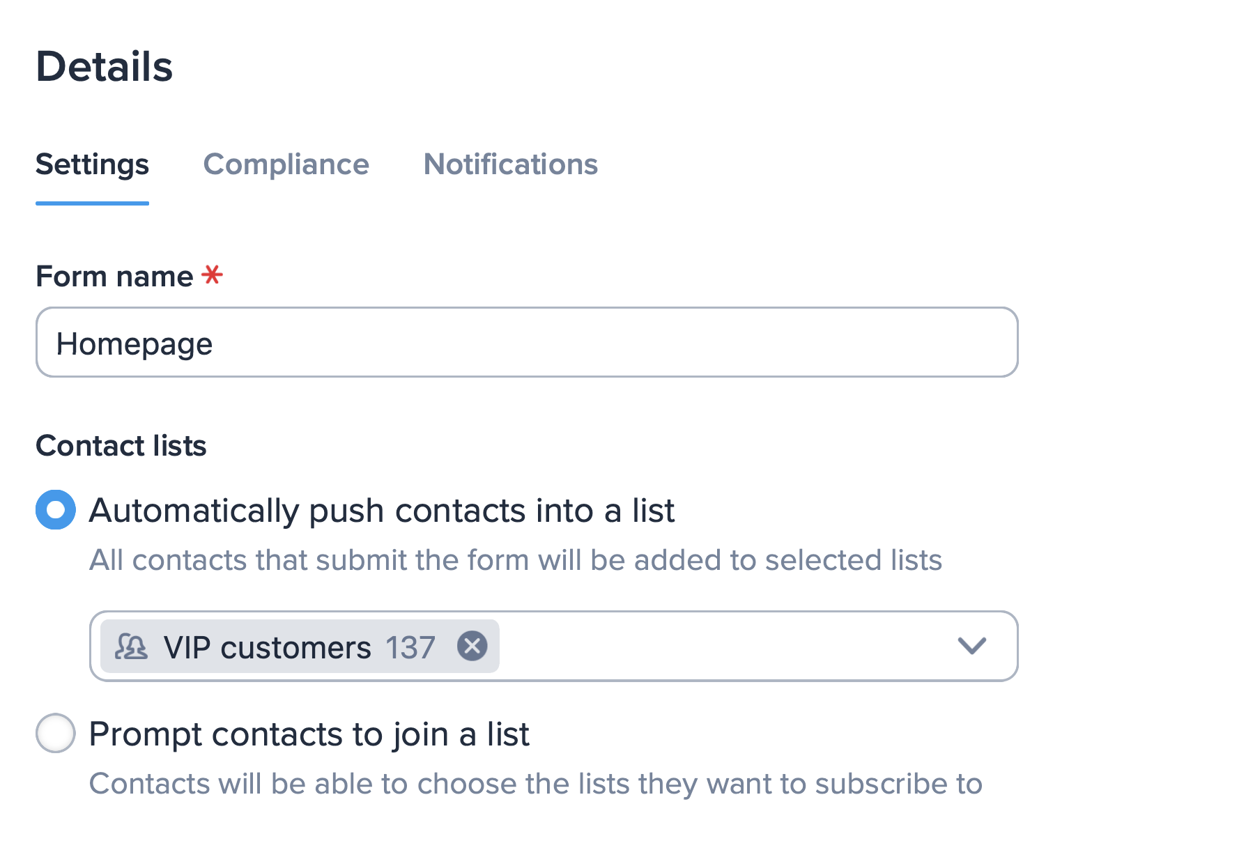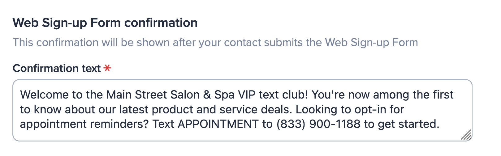 Finally, write your confirmation message. your contacts will see this message once they complete your sign-up form. This is a great opportunity to make the message your ownーthank your new contacts for subscribing, let them know what type of messages they’ll receive, or even add in a special discount or offer.