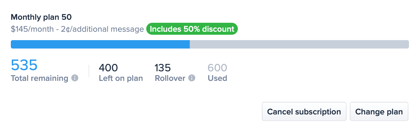 Trying to figure out how many messages you can send this month? We’ve made it easy to see how many credits are left on your plan, and how many are rolled over from the prior month. Just log in to your account and head to the billing section. Visit our help center to get all the details about how rollover credits work.