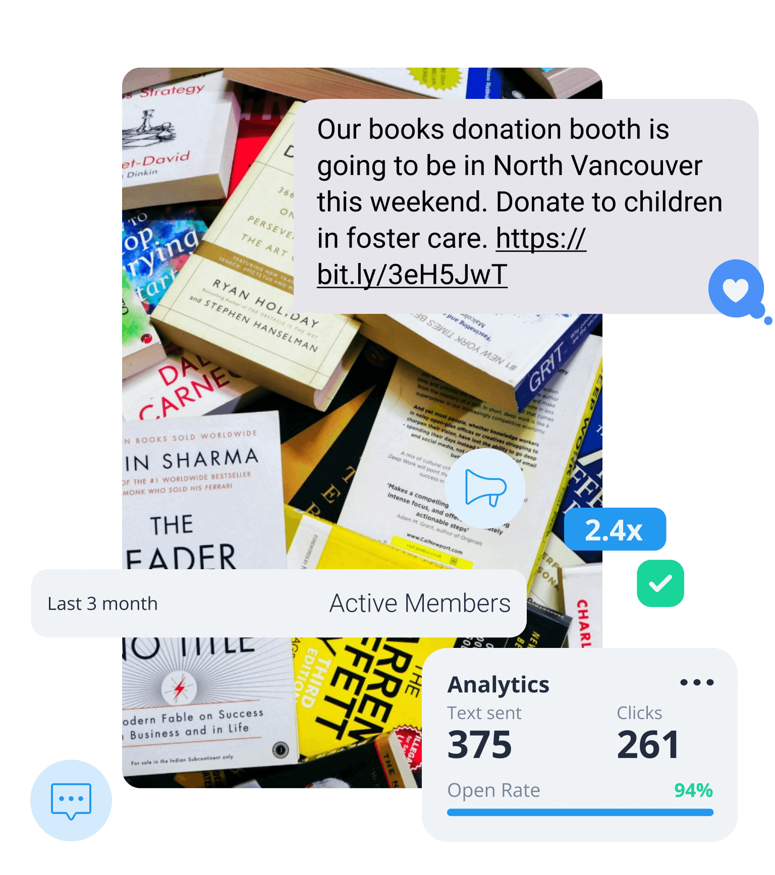 Whether you’re promoting a fundraising event or requesting volunteer help, our intuitive tools make it easy to grow your contact lists, send personalized text messages, and track what’s working.Personalize messages and connect with supporters 1:1