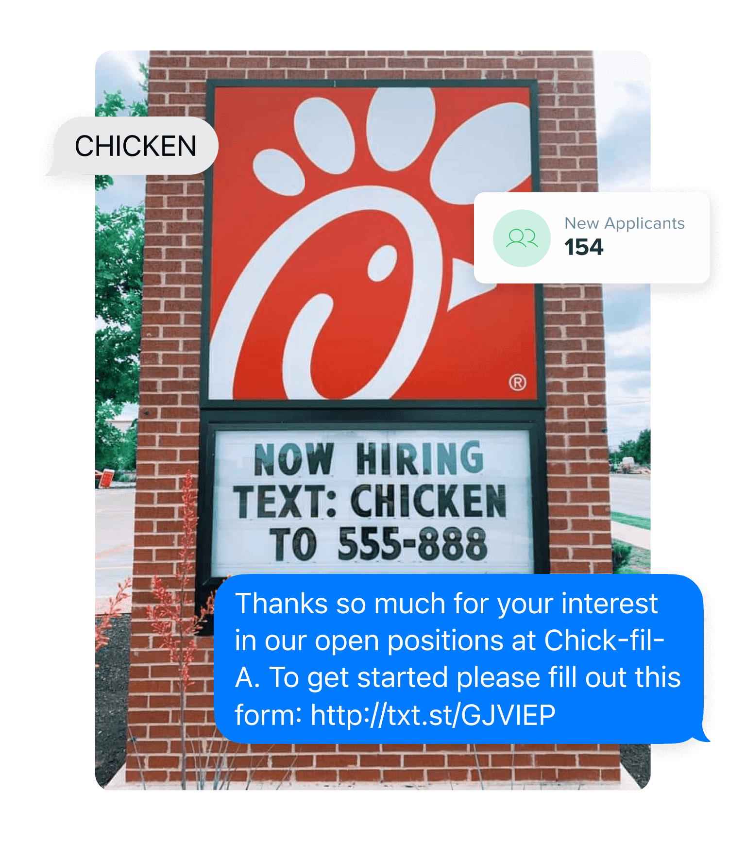 - Promote “now hiring” and openings with text-to-apply