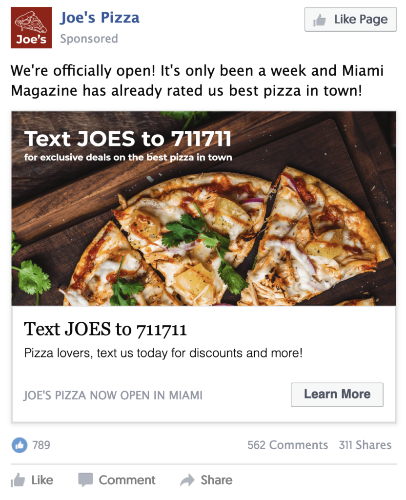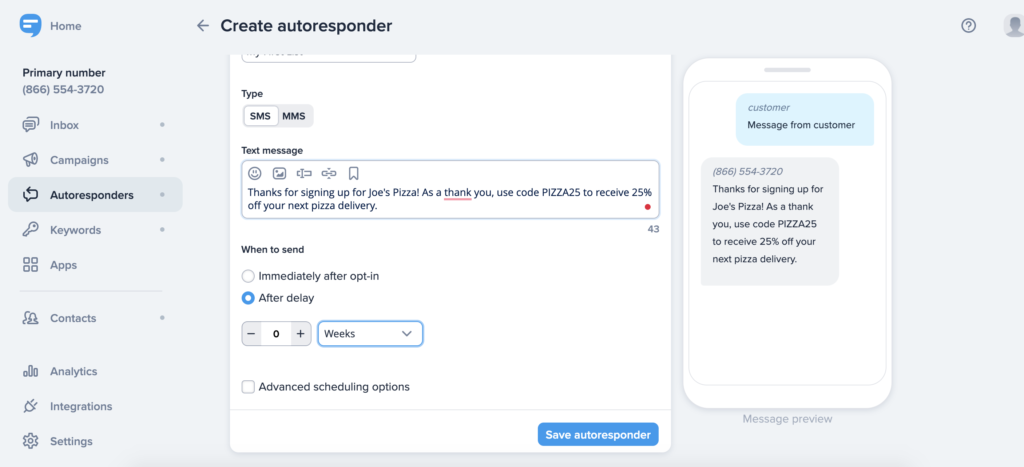 First, a customer may see an online ad for Joe’s Pizza with a call to action that says, “Text JOES to 711711 for exclusive deals on the best pizza in town.” The first autoresponder a new subscriber should receive is a welcome message saying thanks.