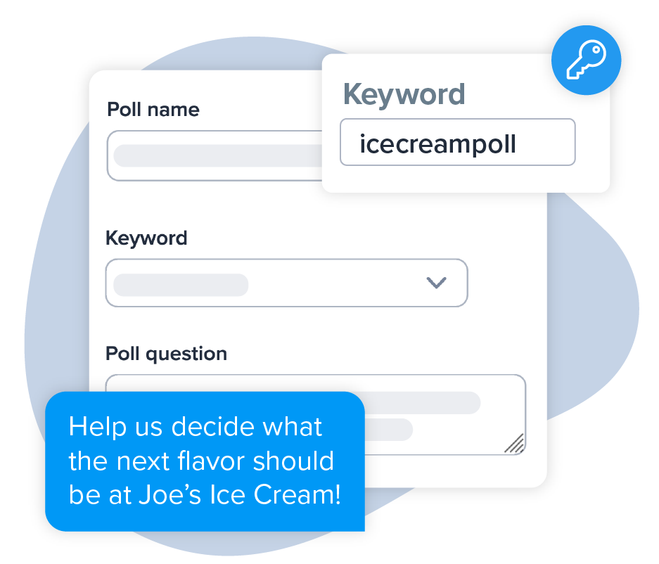 A keyword is a word or phrase your audience can use to join your SMS poll. It takes just a few seconds to create a keyword in SimpleTexting. For example, if you’re sending a customer survey about what ice cream flavor they’d like to see next, you could create the keyword “ICECREAMFLAVOR.”