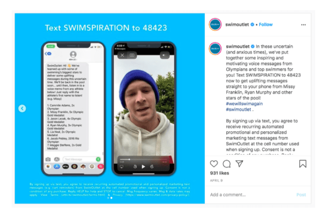 For example, SwimOutlet used texting as a sales channel to send promotions to customers. This year it also began to use text messages to deliver audio and video messages from Olympic athletes such as Ryan Murphy, a three-time Olympic gold medalist in swimming.