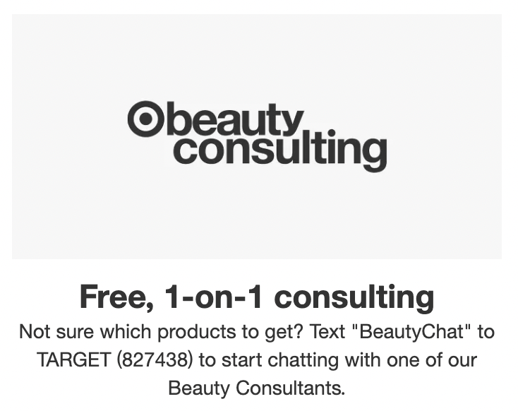 Target has several text messaging programs, including a one-on-one with beauty experts (text BeautyChat to 827438) and automated information about job openings (text JOBS to 827438).