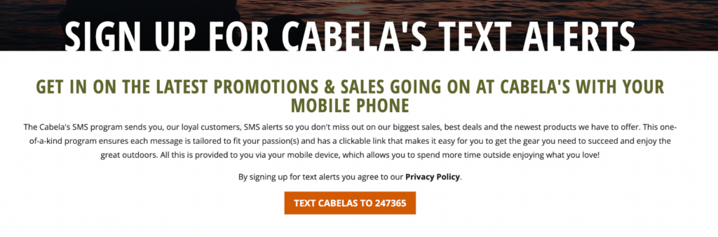 To make it easy to sign up on mobile, Cabela’s added a click-to-text button to their signup page. When someone taps the button, a message is pre-filled in their default SMS app.