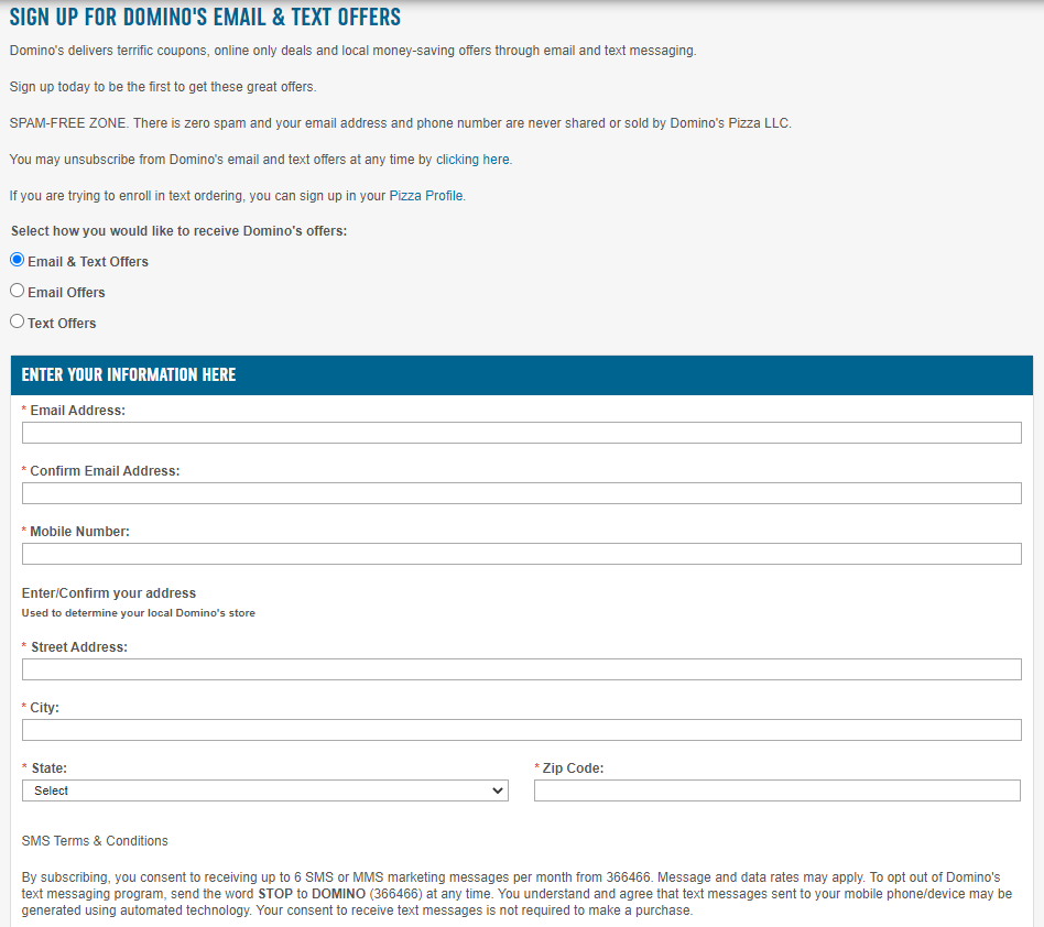 Instead of a keyword, Domino’s uses a signup form to collect contacts for their text club. Customers can enter their phone number and opt in to receive discounts.