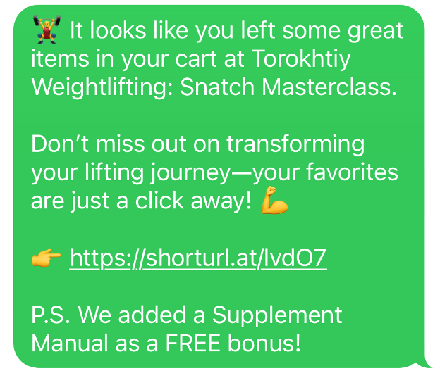 The surprise you offer in an abandoned cart text can also be an actual gift. That could be a small item such as a product sample or something useful and educational. For example, Torokhtiy Weightlifting encourages customers to finish their class registrations with a free manual: