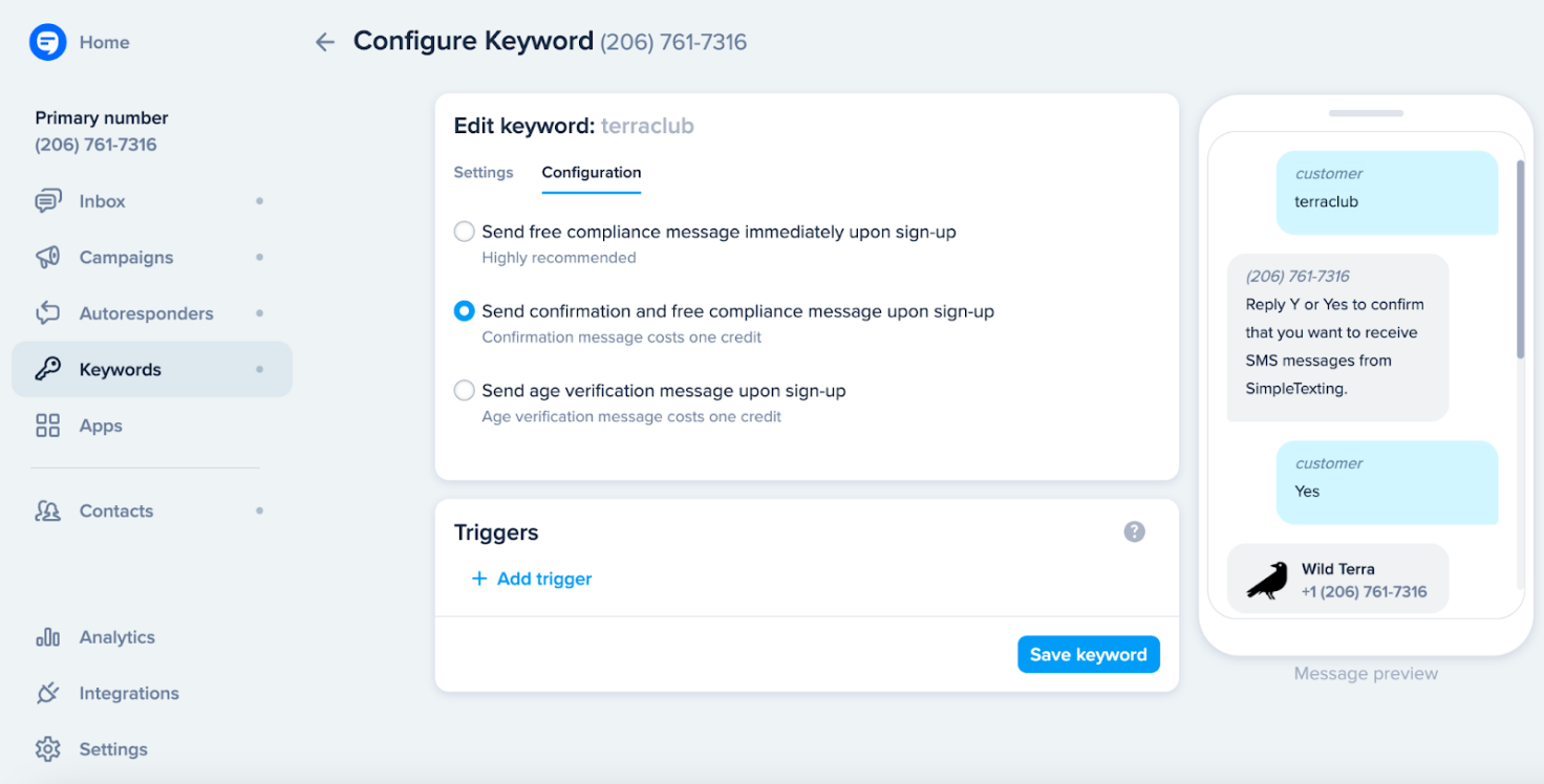 It’s good practice to give your customers ample opportunity to understand what they’re signing up for and confirm they agree to it. You can add a double opt-in to your text message sign-ups with SimpleTexting’s Configuration feature.