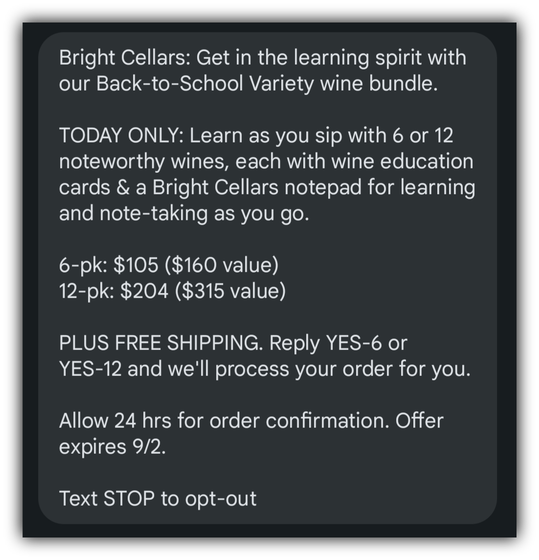 Note how this promotional message example from Bright Cellars includes opt out instructions at the end, “Text STOP to opt-out”.