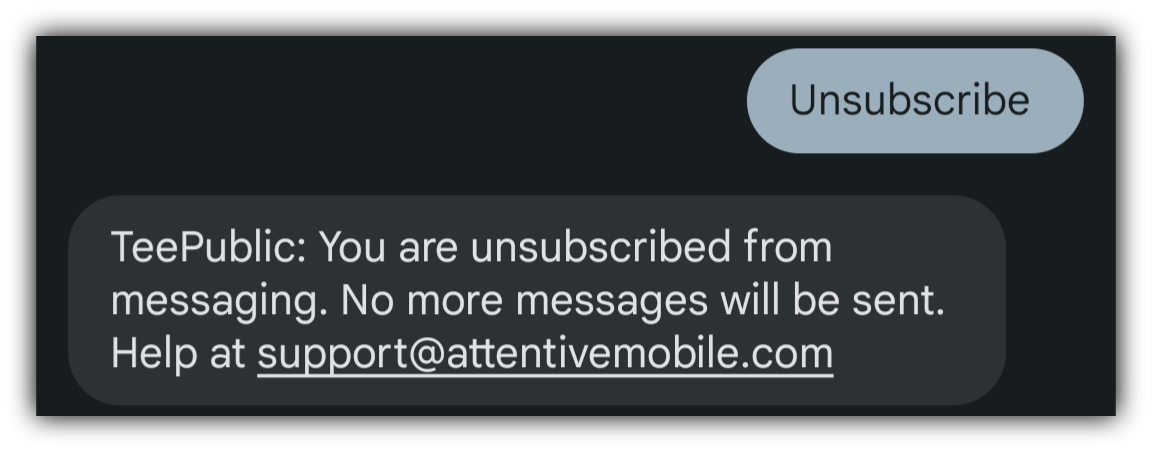 CTIA regulations say that you must still honor these opt-outs and act on them the same way you would if a subscriber sent the word “STOP”, like this example from TeePublic: