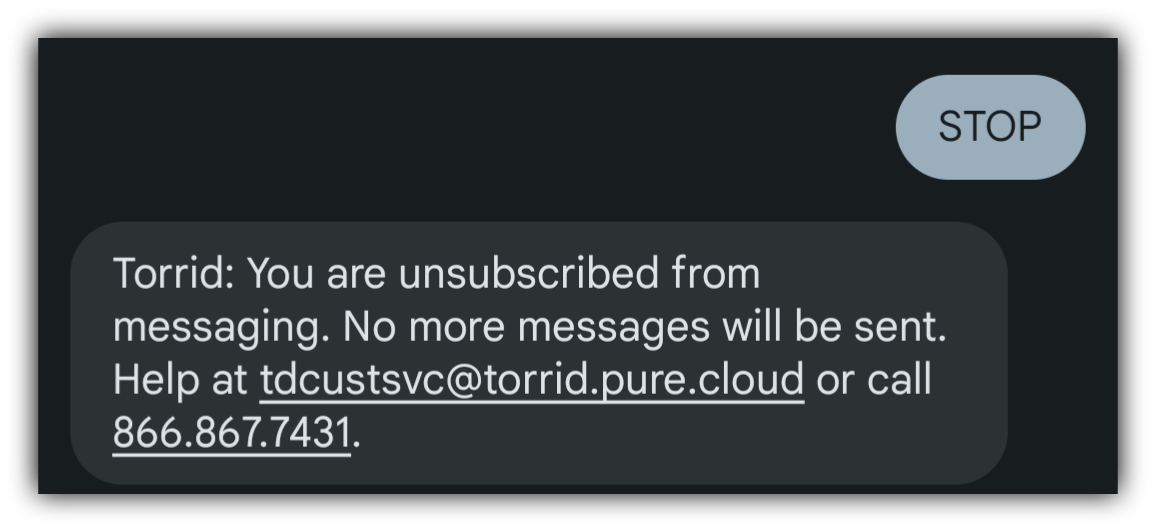 This confirmation message is to notify the recipient that they’ve opted out — and it should be the very last message you send them. According to the CTIA, your opt-out confirmation message must also include, “Program (brand) name OR product description” like this example from Torrid: