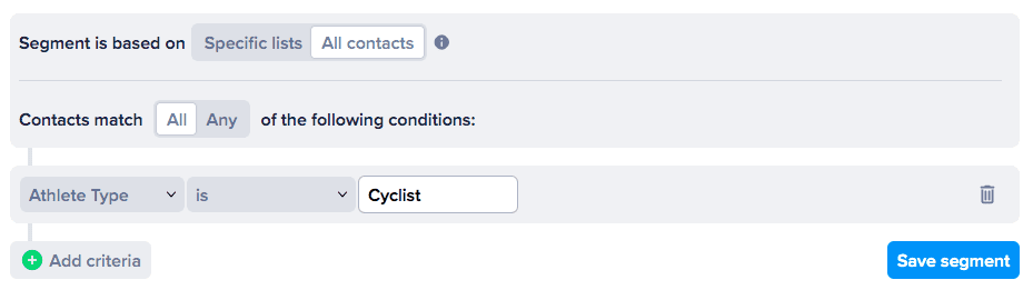 Within SimpleTexting, you can group subscribers based on shared traits, then send out highly targeted text message campaigns to drive repeat purchases. Using the example above, we could create a segment called “Cyclists.”