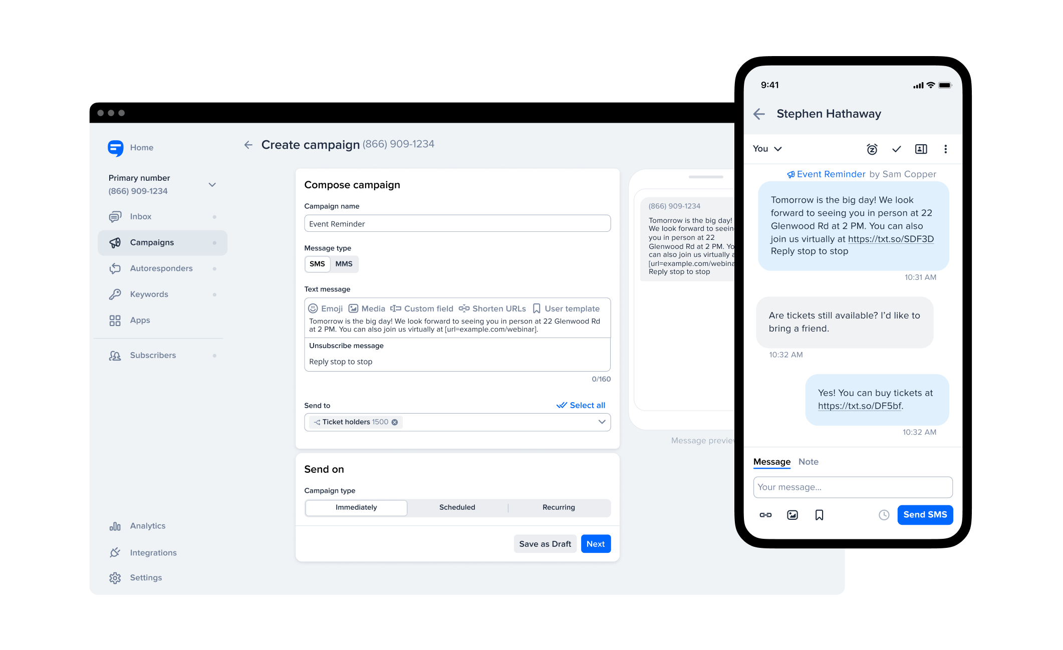 Texting works even when you’re not. Connect to other apps to trigger event-based messages or set up a simple OOO text.