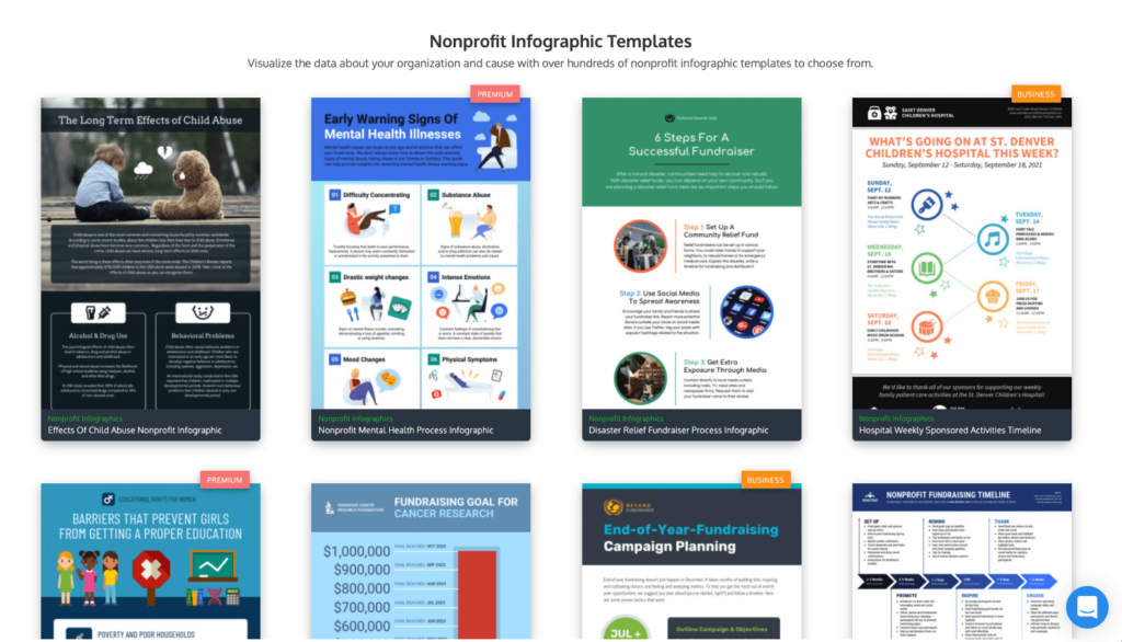 Nothing elevates an annual report to donors quite like a clean, visually appealing infographic. Once again, these deliverables are something that might run you a few hundred dollars from a designer. However, the tool Piktochart uses a simple drag-and-drop designer to help you create professional-looking graphics. A free, basic account is available. But as a special deal for nonprofits, plans with full access to all their graphics and features are available for only $39.99/year!