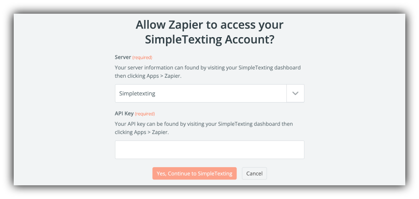 Zapier will prompt you to Sign in to Connect SimpleTexting. A screen will appear where you’ll enter your API Key. Paste your key and hit Yes, Continue to SimpleTexting.