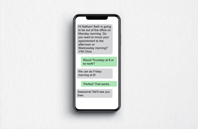 A few days before one of my appointments, I got a text from FM Chiropractic. My chiropractor wasn’t going to be available, so FM Chiropractic was being proactive to retain my business.