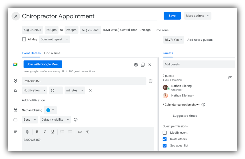Your appointment software should contain important information like phone number. For this example, we will create a sample event in your Google Calendar that has a phone number in the Description field.