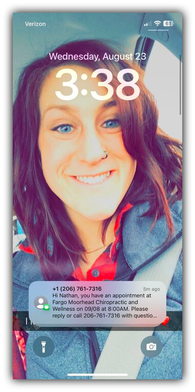 Example: “Hi %%firstname%%, you have an appointment at Fargo Moorhead Chiropractic and Wellness on 09/08 at 8:00AM. Please reply or call 206-761-7316 with questions.”