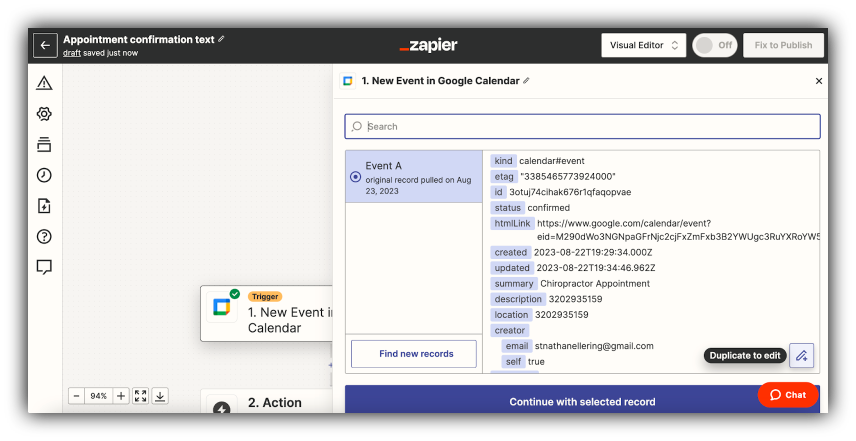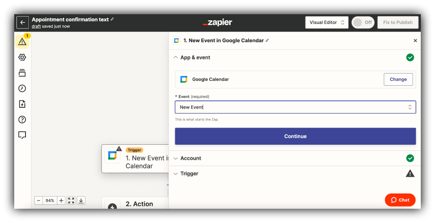 Sign up for a free trial of Zapier (or sign in) and Create Zap. Follow Zapier’s prompts to integrate Google Calendar as the first step Trigger. For Event, select New Event.