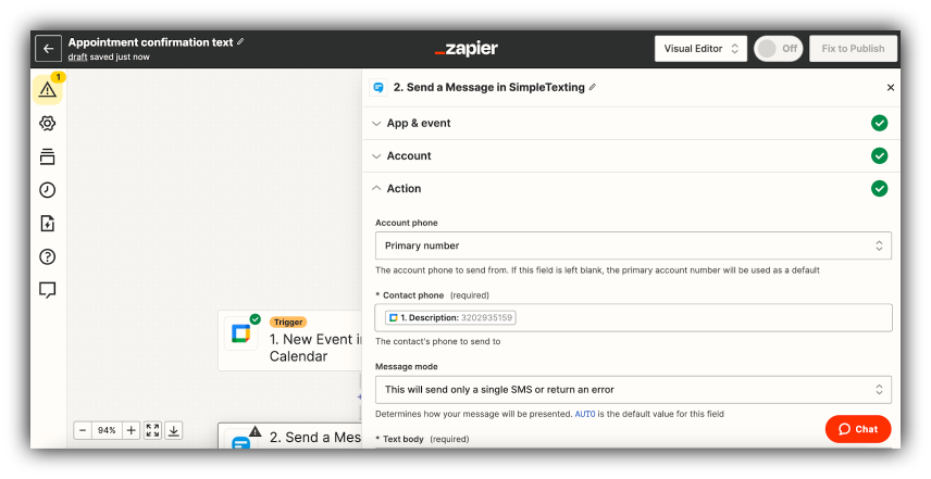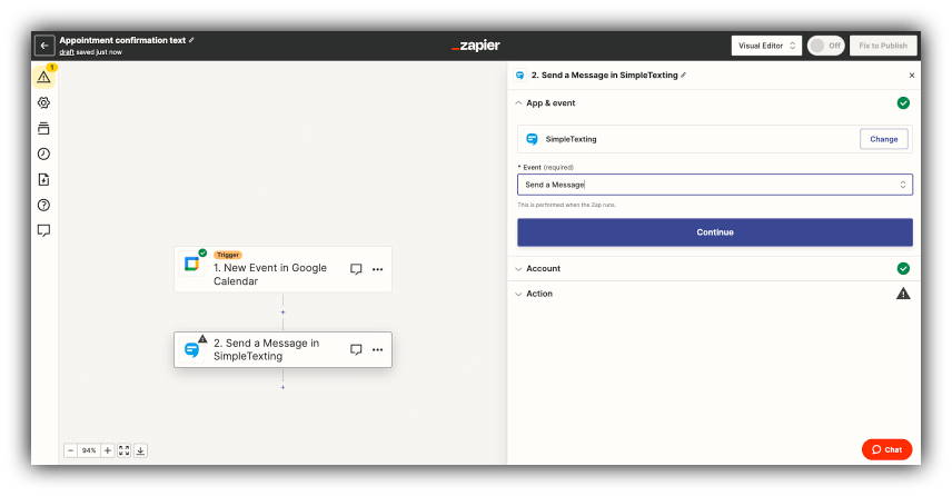 Let’s walk through how to send text message confirmations when a new Google Calendar appointment is created. When a Google Calendar appointment is created, Zapier will tell SimpleTexting to send a text.