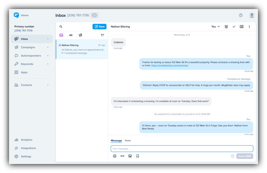 Test, then see your hard work in SimpleTexting! Log into SimpleTexting, navigate to Inbox, and see your appointment confirmation. Or if you sent that text to your own phone number, check your phone. 😀