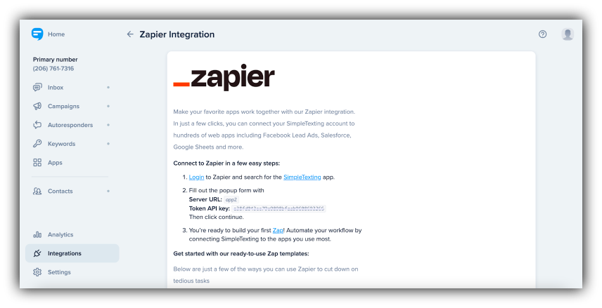 Log into SimpleTexting, select Integrations in the left menu, and click Zapier Integration.