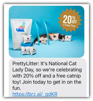 Cat litter brand PrettyLitter, as the name suggests, adds visual flair to their SMS marketing campaigns with images.