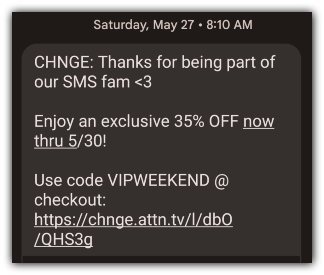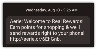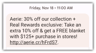 Tempt your text contacts to jump on sales or special occasions with a little extra incentive in the form of a free gift. Among the brands I personally subscribe to, apparel brand Aerie is king.