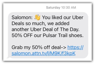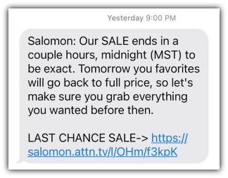 Salomon is a sports equipment company that creates urgency by highlighting its sale deadlines to text subscribers. The thing that stands out to me about this example is that they explicitly point out the fact that products will be back to full price the next day.