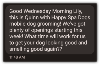 I won’t lie to you, I became a Petco devotee recently, but as soon as I got this text from Happy Dogs I replied and set an appointment.