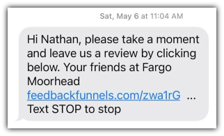 Fargo Moorhead Chiropractic gathers its reviews with a short, sweet text asking for their contact’s opinion. Notice that they also added a convenient link to make engaging with the message easy.
