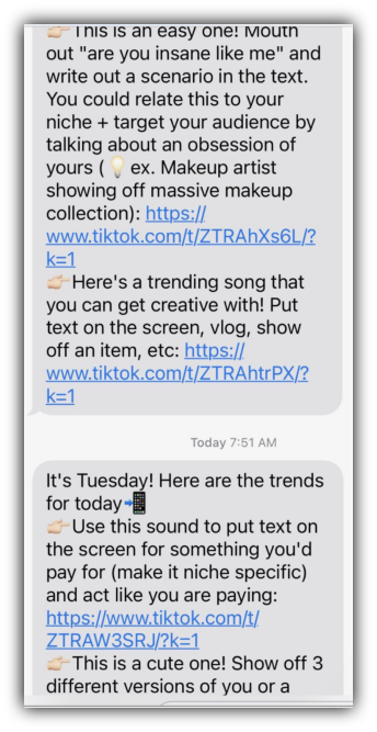 SimpleTexting user and social media coach Sydney McDonald texts out a daily roundup of TikTok trends for her clients. As you can see here, these texts are clear, digestible, and creatively formatted.