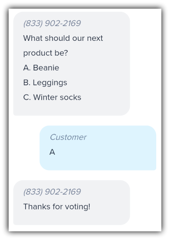 In a text-to-vote format, you’ll send out a question and a series of multiple-choice answers. All contacts will have to do is reply with the letter corresponding to their answer.