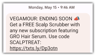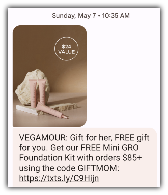 Vegamour ran a Mother’s Day special recently with a special code. Notice how this message highlights the benefits for both the buyer and their mom in just a few characters.