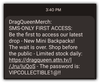 This is something DragQueenMerch does very well. They make it clear that text subscribers get unique, tempting perks not available to their other customers.