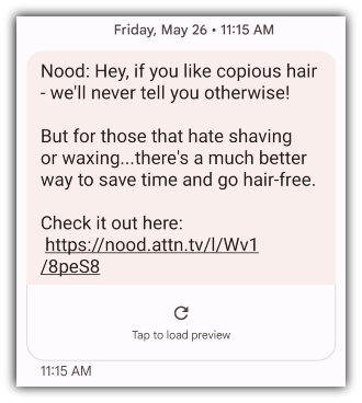On that note, if your brand has a unique, fun voice, lean into it in your messages. Hair removal brand Nood is legendary for its sassy marketing, and it shows in every text.