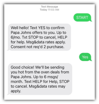 This example from restaurant chain Papa John’s includes all the necessary compliance information along with the kinds of messages contacts can expect to receive.