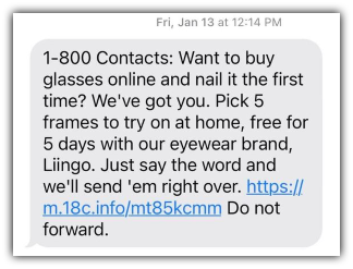 1-800 Contacts stands out among other brands that use SMS because they address a common pain point of glasses-wearers immediately before announcing their sale.