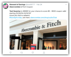 They created the keyword “Surprise” and invited folks to text it in to their designated short code. In return, customers automatically received either a $5, $10, $25, or $500 gift card/coupon! Everyone was a winner (and incentivized to make a purchase) but the potential of the $500 prize made it even more tempting to join Abercrombie’s list.