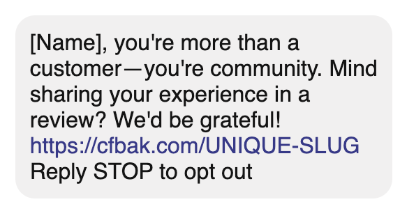 Sending a message like the one below can encourage more reviews simply because you’ve taken the time to show you care about them (and reminded them that you exist!). A text-based customer service program gives you another way to keep your customers happy.
