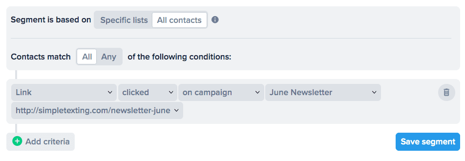 The more relevant your messages, the more effective they’ll be. Our Segments feature makes it easy to group subscribers based on common traits, then send out highly targeted text message campaigns. All you have to do is select the lists you want to segment, and add the criteria you want to use to group subscribers.